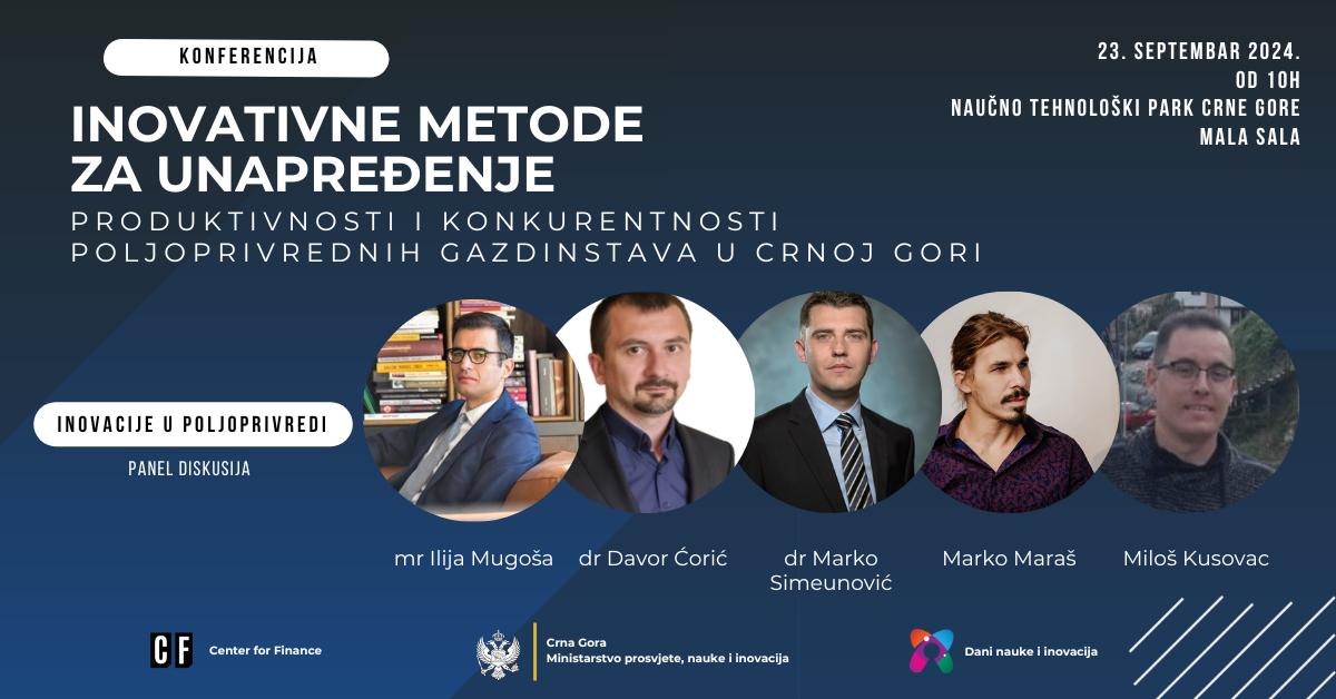 Centar za finansije, kao naučno-istraživačka organizacija i nosilac projekta, uspješno je organizovao konferenciju „Pametna poljoprivreda – Inovativne metode za unapređenje produktivnosti i konkurentnosti poljoprivrednih gazdinstava u Crnoj Gori“, održanu 23. septembra 2024. godine u maloj sali Naučno-tehnološkog parka Crne Gore, u skladu sa zvanično najavljenim programom. Događaj je okupio 48 učesnika iz 16 institucija i kompanija. Tokom konferencije istaknuta je uloga pametnih tehnologija, digitalizacije i naučno-istraživačkog rada u jačanju konkurentnosti crnogorskih poljoprivrednih gazdinstava.​