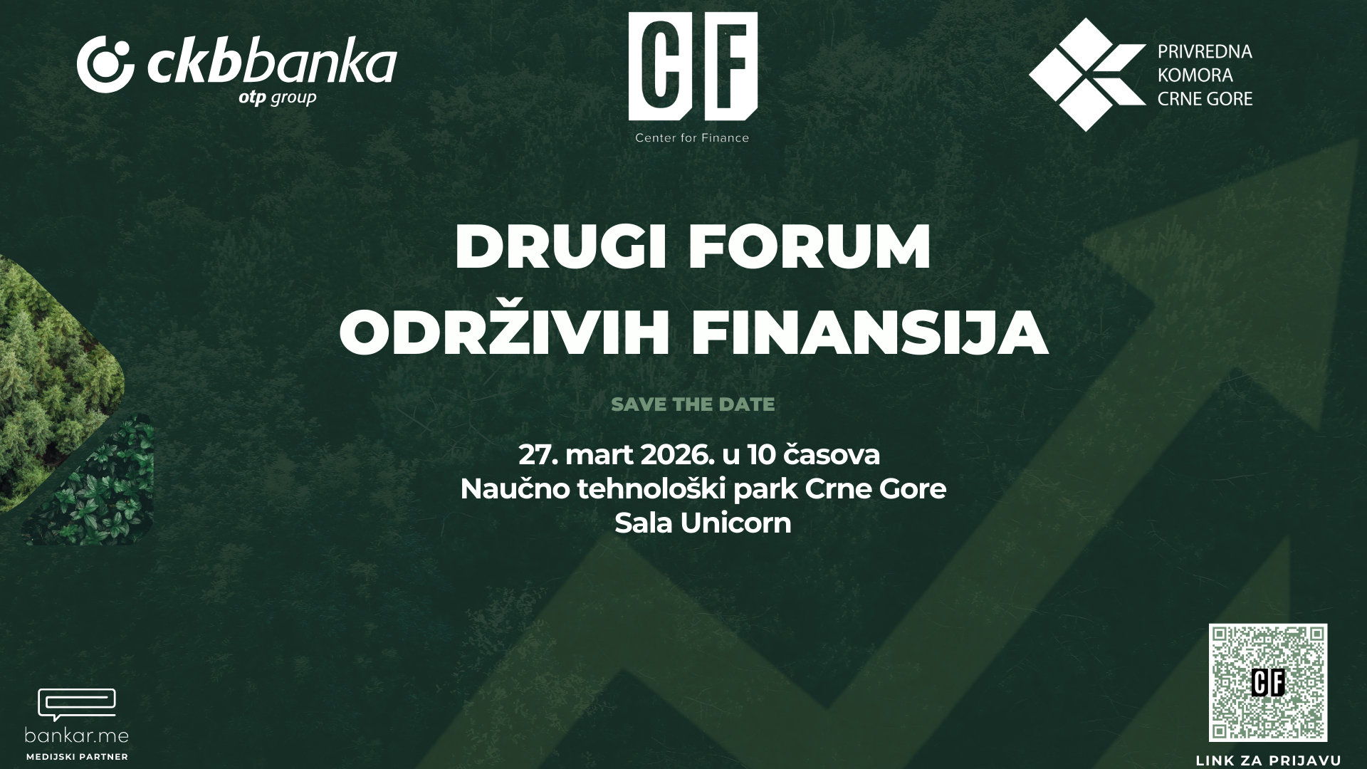 Center for Finance, u partnerstvu sa Privrednom komorom Crne Gore i Crnogorskom komercijalnom bankom, organizuje Forum održivih finansija – platformu koja okuplja lidere finansijskog i poslovnog sektora s ciljem unapređenja održivog razvoja i finansijskih praksi budućnosti. Drugi forum održivih finansija će se održati 27. marta 2026. godine sa početkom u 10.00 časova u Naučno-tehnološkom parku Crne Gore (sala Unicorn).